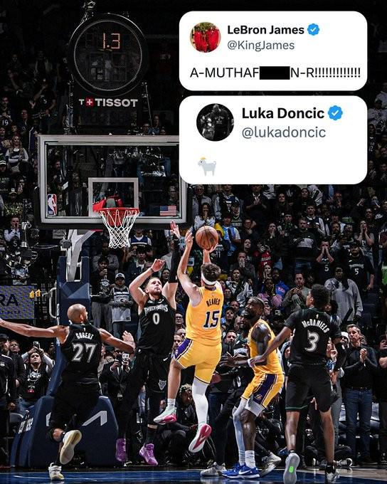 在里夫斯完成抛投绝杀后,湖人队因伤休战的两位核心球员东契奇和詹姆斯先后发布社媒称赞里夫斯的精彩表现。詹姆斯写道:“这tm的里夫斯!!!!!”东契奇则言简意赅地发布了一个山羊的表情,称赞里夫斯为“GOAT”(历史最佳球员缩写,同山羊的英文goat)。